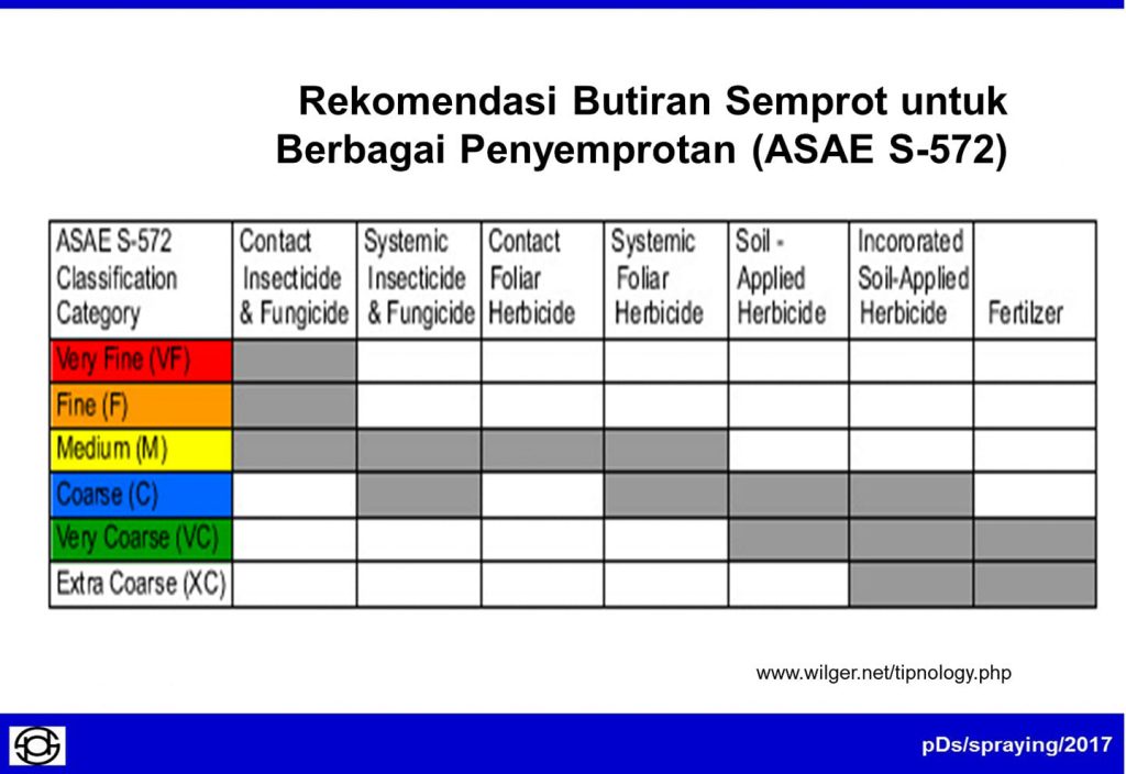 Sementara untuk GULMA digunakan droplet SEDANG hingga KASAR. Butiran semprot halus biasanya diperoleh dari nozzle kerucut, droplet sedang dari nozzle kipas, dan droplet kasar dari nozzle polijet.