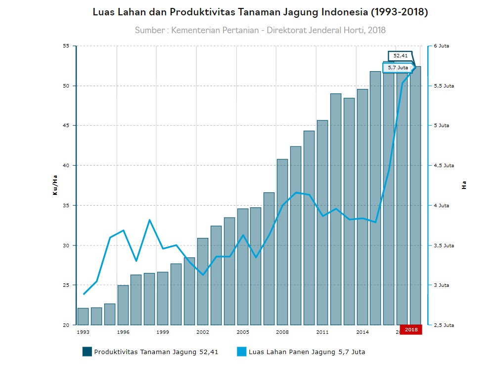 Dikutip dari katadata.co.id, yang dikutip dari data Kementerian Pertanian produksi jagung Indonesia (Angka Ramalan I) pada 2018 seberat 30,56 juta ton dengan luas lahan panen 5,73 juta hektare (ha). Alhasil, produktivitas jagung nasional tahun lalu seberat 52,41 kuintal/ha.