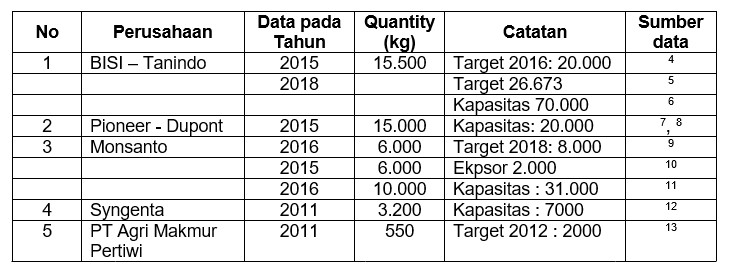 Berikut adalah kapasitas produksi benih jagung hibrida masing-masing perusahaan multi nasional dan nasional.