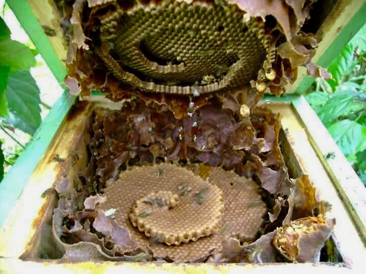 Lebah trigona klanceng secara alami tinggal di dalam log kayu, kadang bekas sarang rayap.