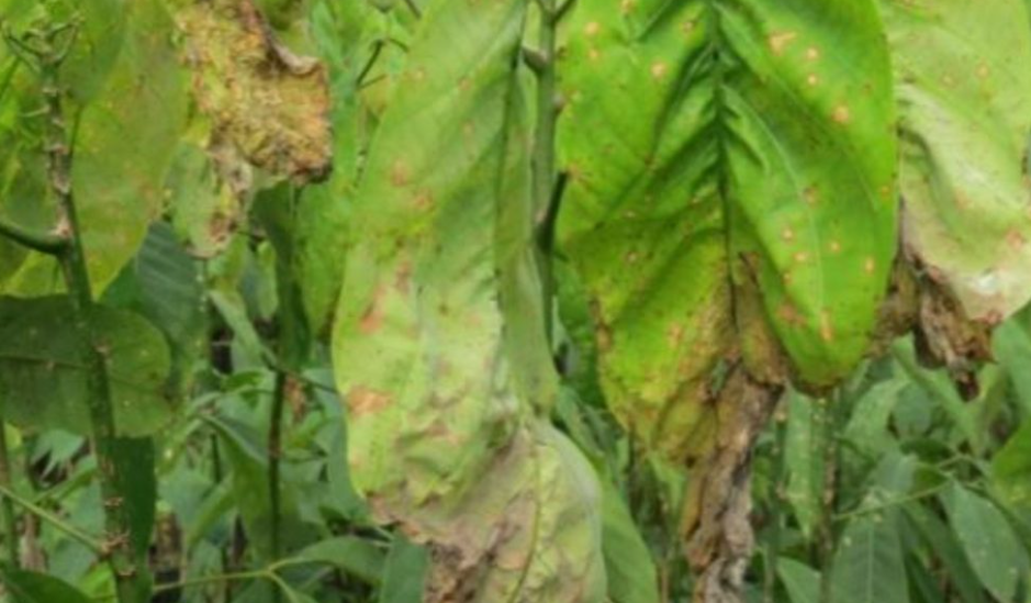 Penyakit gugur daun Colletotrichum menyerang daun muda menimbulkan bercak bercak berwarna coklat kehitaman kemudian daun mengerut, busuk kebasahan pada bagian daun yang terinfeksi hingga gugur daun.