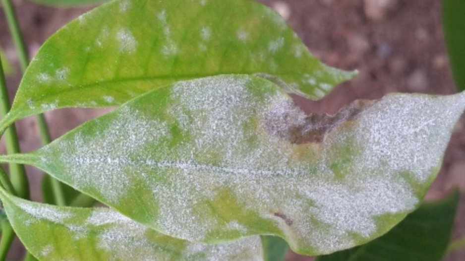 Embun tepung menyerang bagian daun dengan gejala permukaan bawah daun terdapat bercak putih seperti tepung halus. Serangan lanjut mengakibatkan daun melengkung, ujung daun mati hingga gugur.