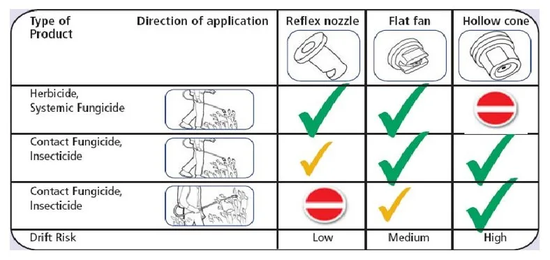 Memilih jenis dan ukuran nosel sangat penting: untuk tingkat volume air (l / ha), ukuran dan distribusi droplet.
