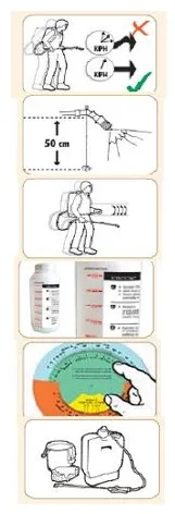 Untuk mendapatkan hasil penyemprotan yang sesuai dengan tujuan penyemprotan jangan lupa baca label produk pestisida yang akan digunakan, ikuti instruksi kalibrasi, sesuai nozzle dengan produk yang akan diaplikasikan, dan ukur luas bidang semprot.   Sesuaikan volume air (l/ha) dalam batas yang disarankan untuk kebutuhan spesifik Anda seperti tahap pertumbuhan tanaman