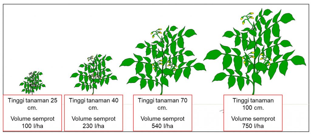 Contoh pada gambar, untuk menyemprot tanaman cabai yang tingginya 25 cm, volume semprotnya cukup 100 liter/ha, tanaman tinggi 40 cm 230 liter, tanaman tinggi 70 cm 540 litèr/ha dst.