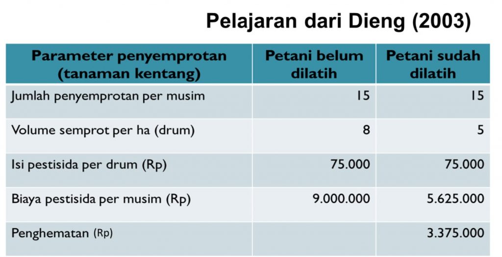 Bila pada setiap drum dimasukkan insektisida dan fungisida (entah berapa macam) dan setiap musim petani menyemprot 15 kali, maka uang yg dapat dihemat dari penurunan volume semprot dapat dilihat pada tabel berikut.