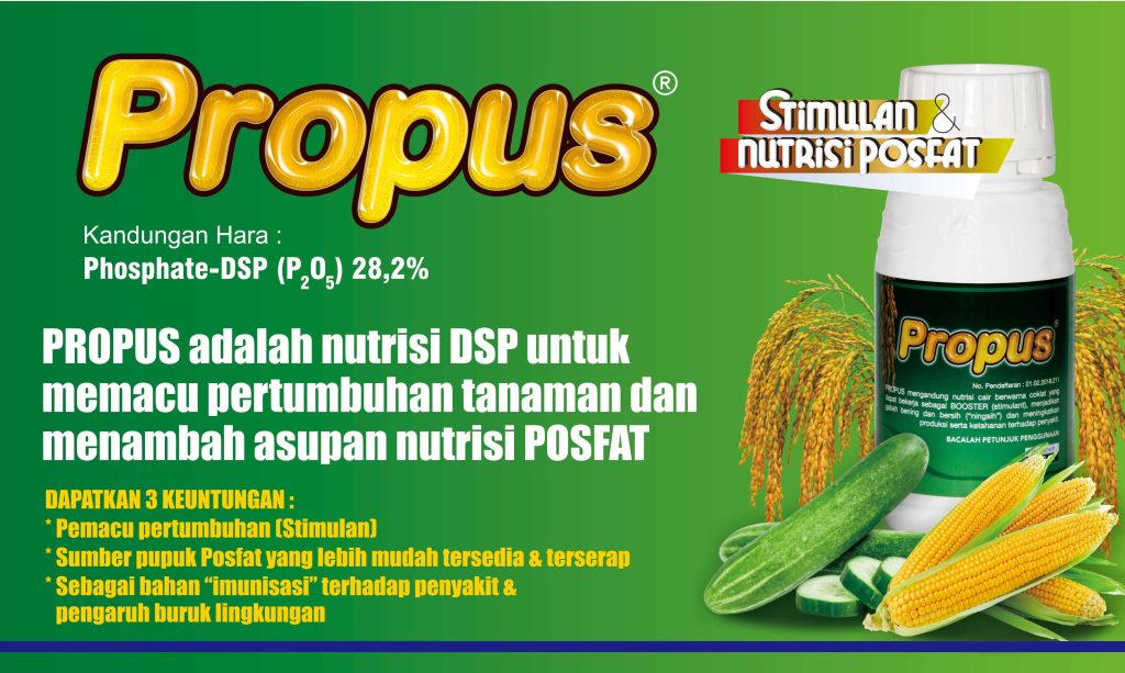 PROPUS mengandung nutrisi DSP (Disodium Phofsit) cair berwarna coklat yang dapat bekerja sebagai pemacu pertumbuhan tanaman (BOOSTER/STIMULAN).